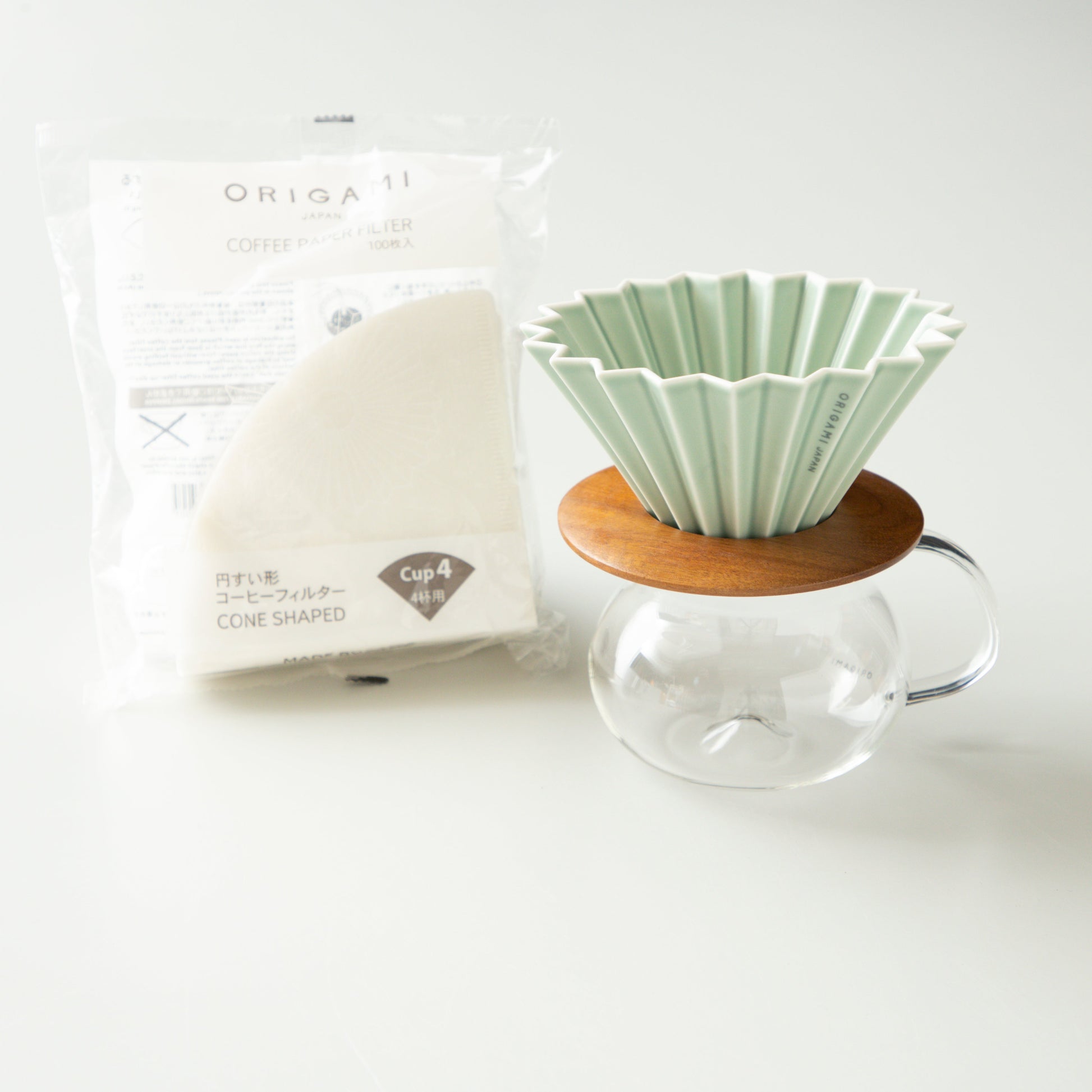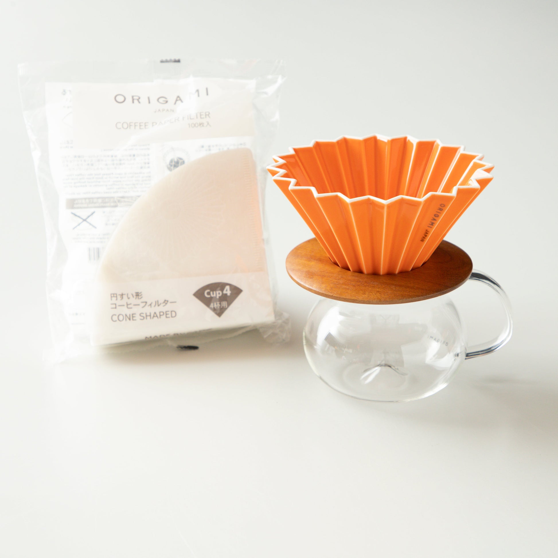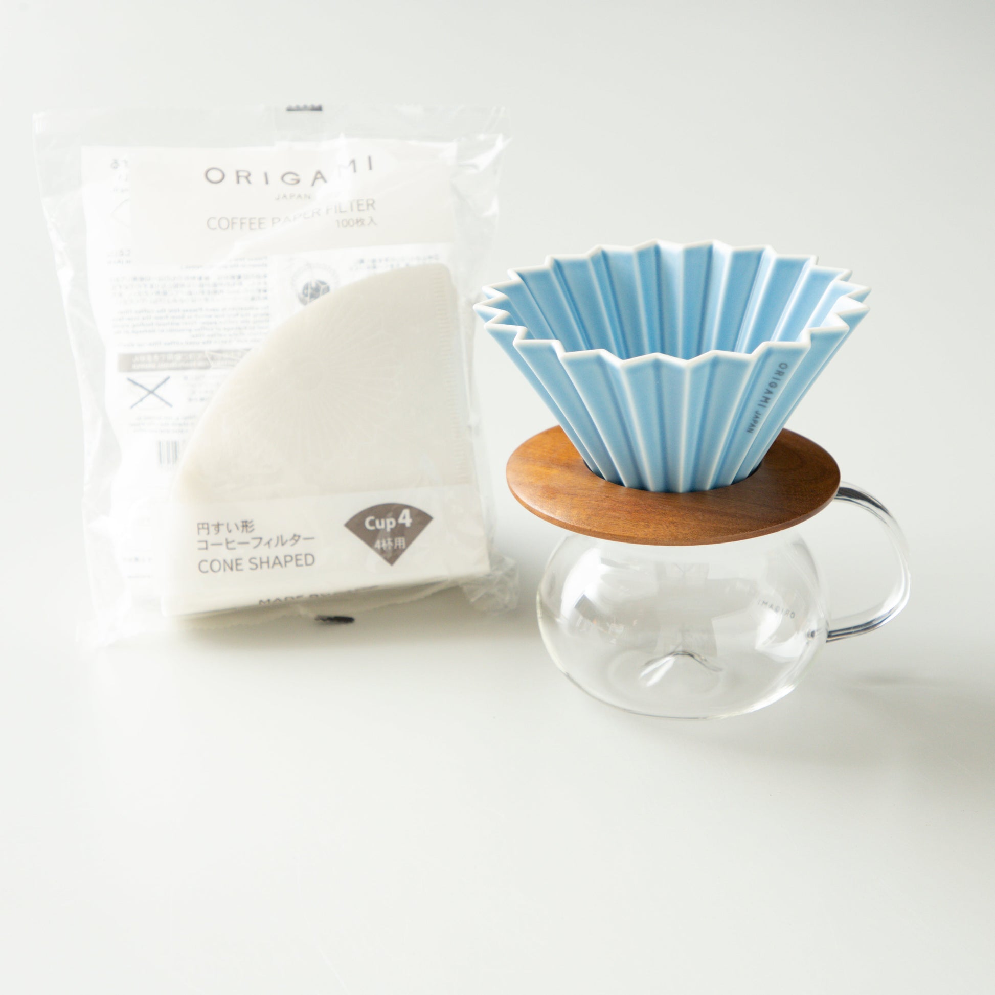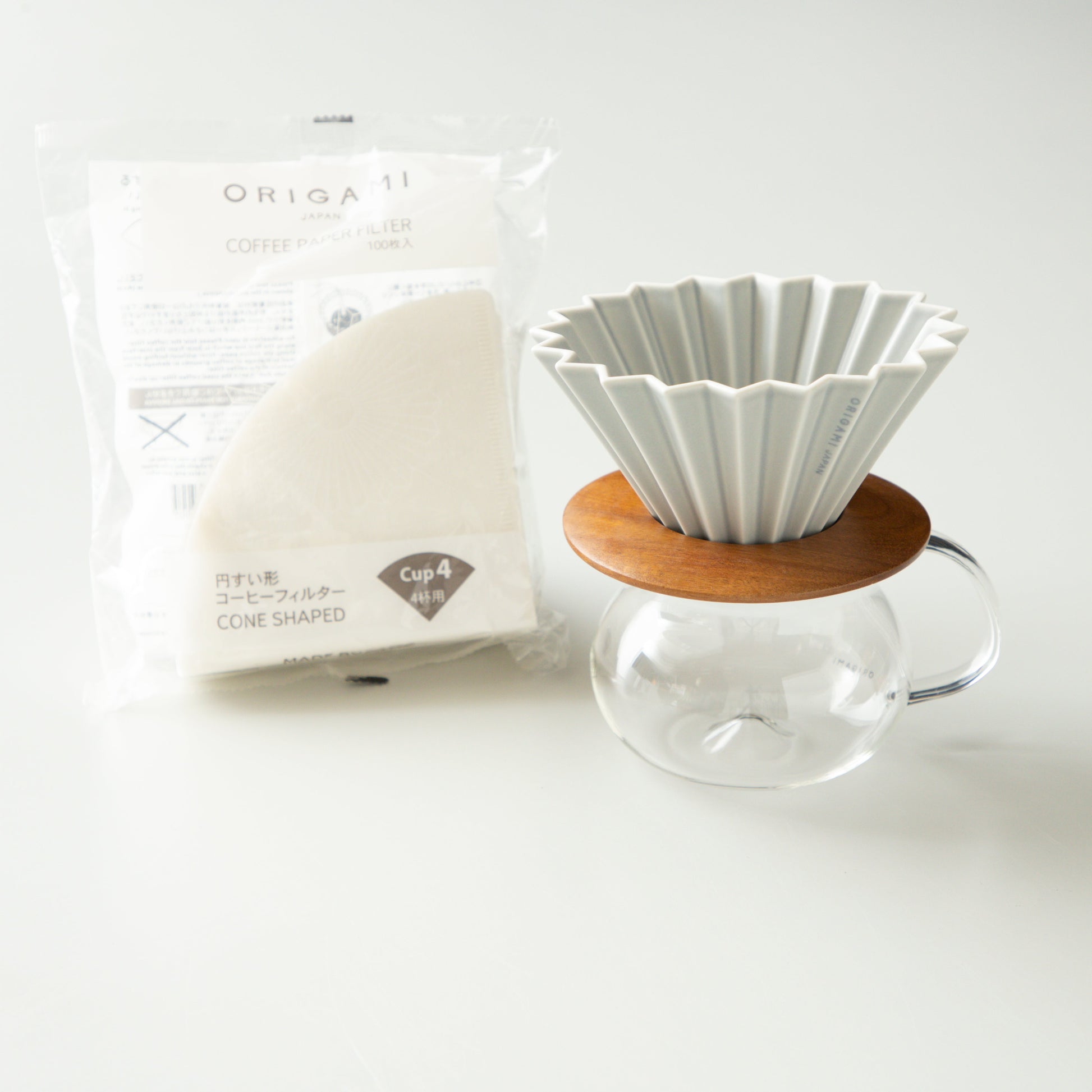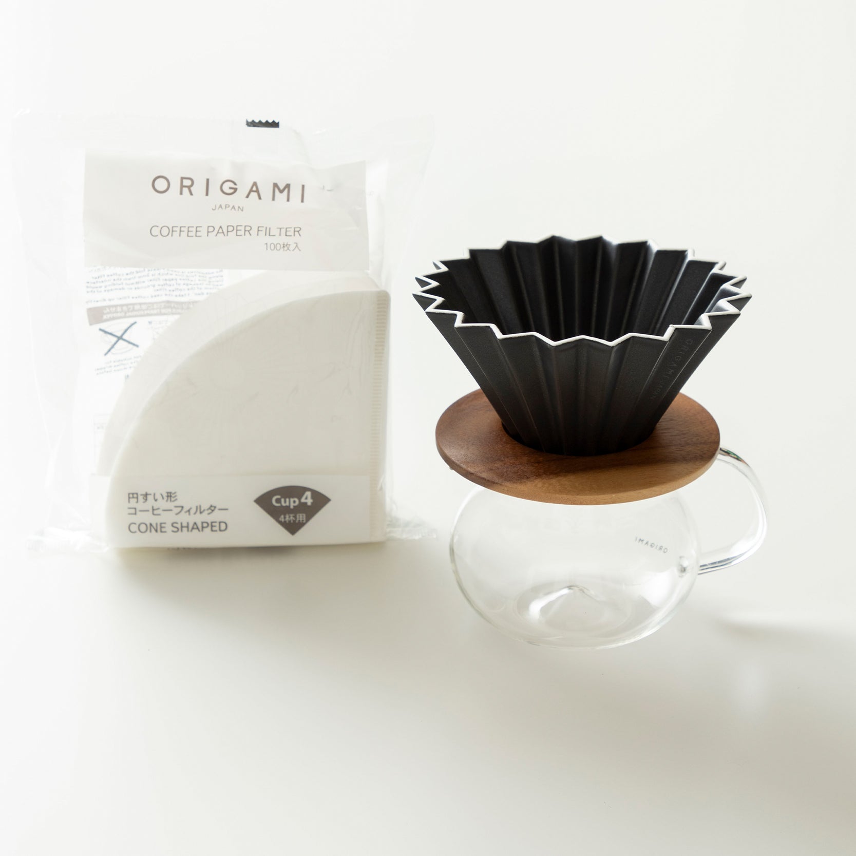 ORIGAMI Dripper M, Dripper Holder, PINOT Aroma Glass Server with paper filter.