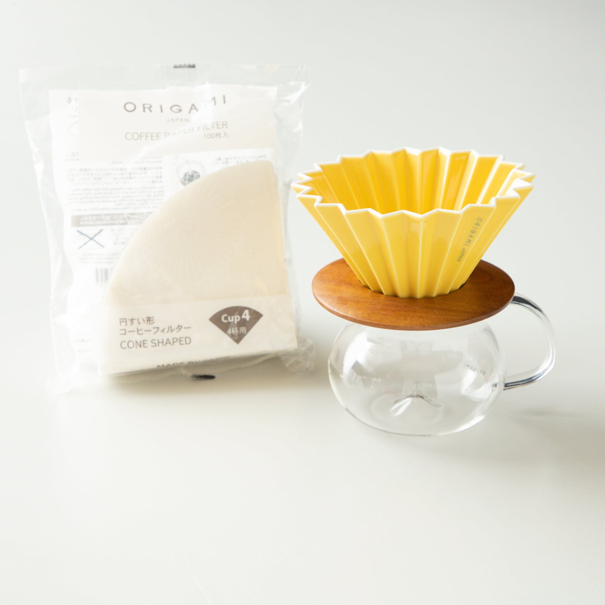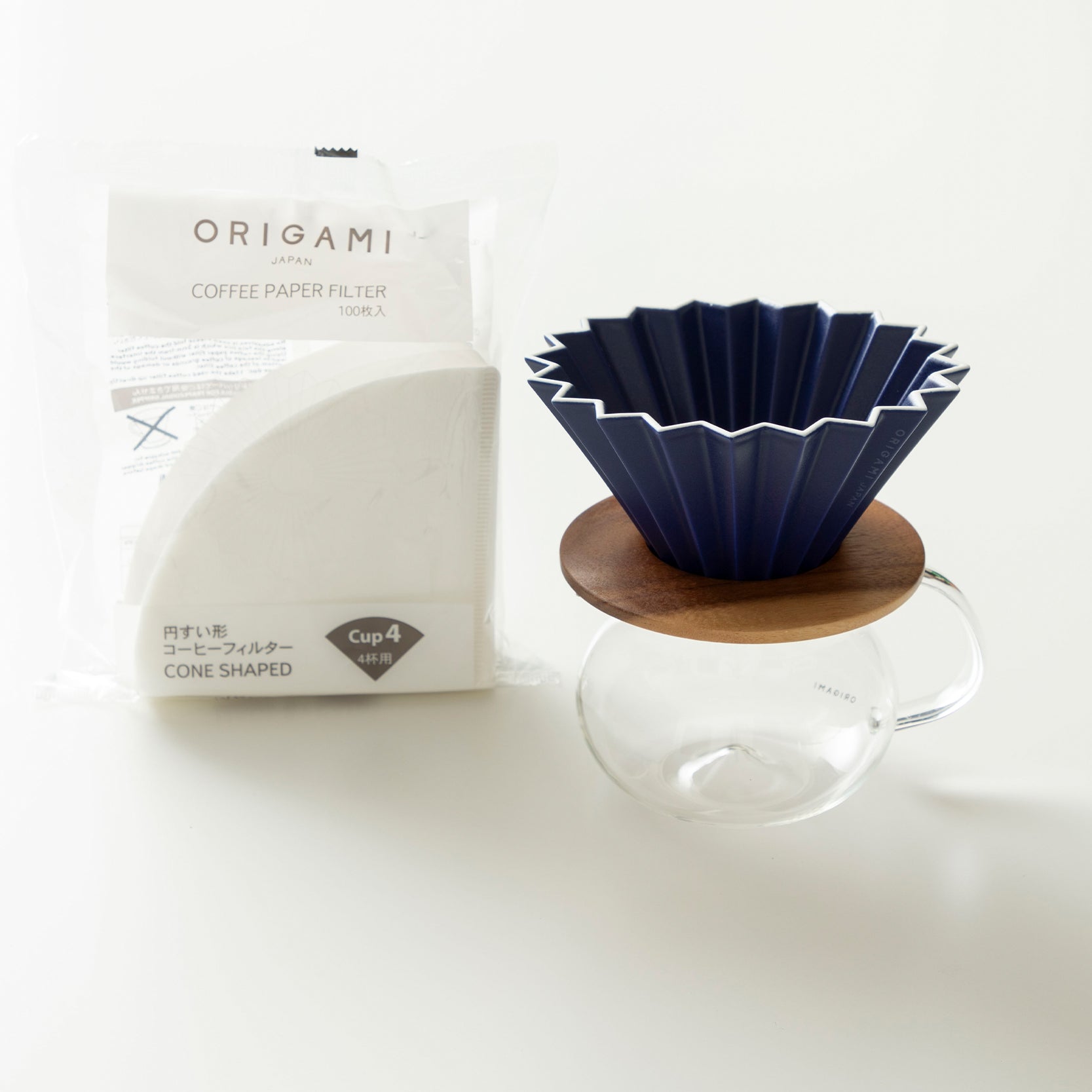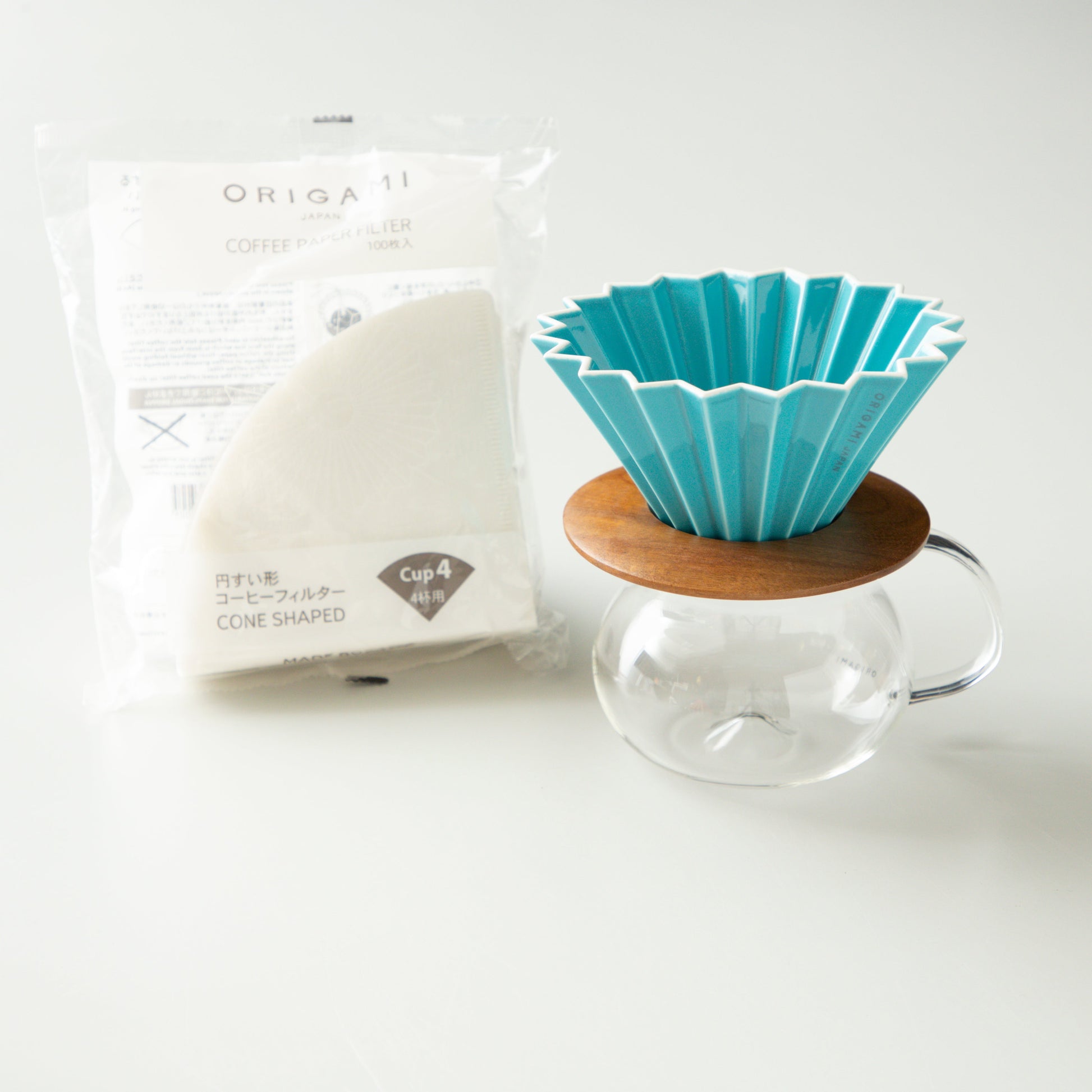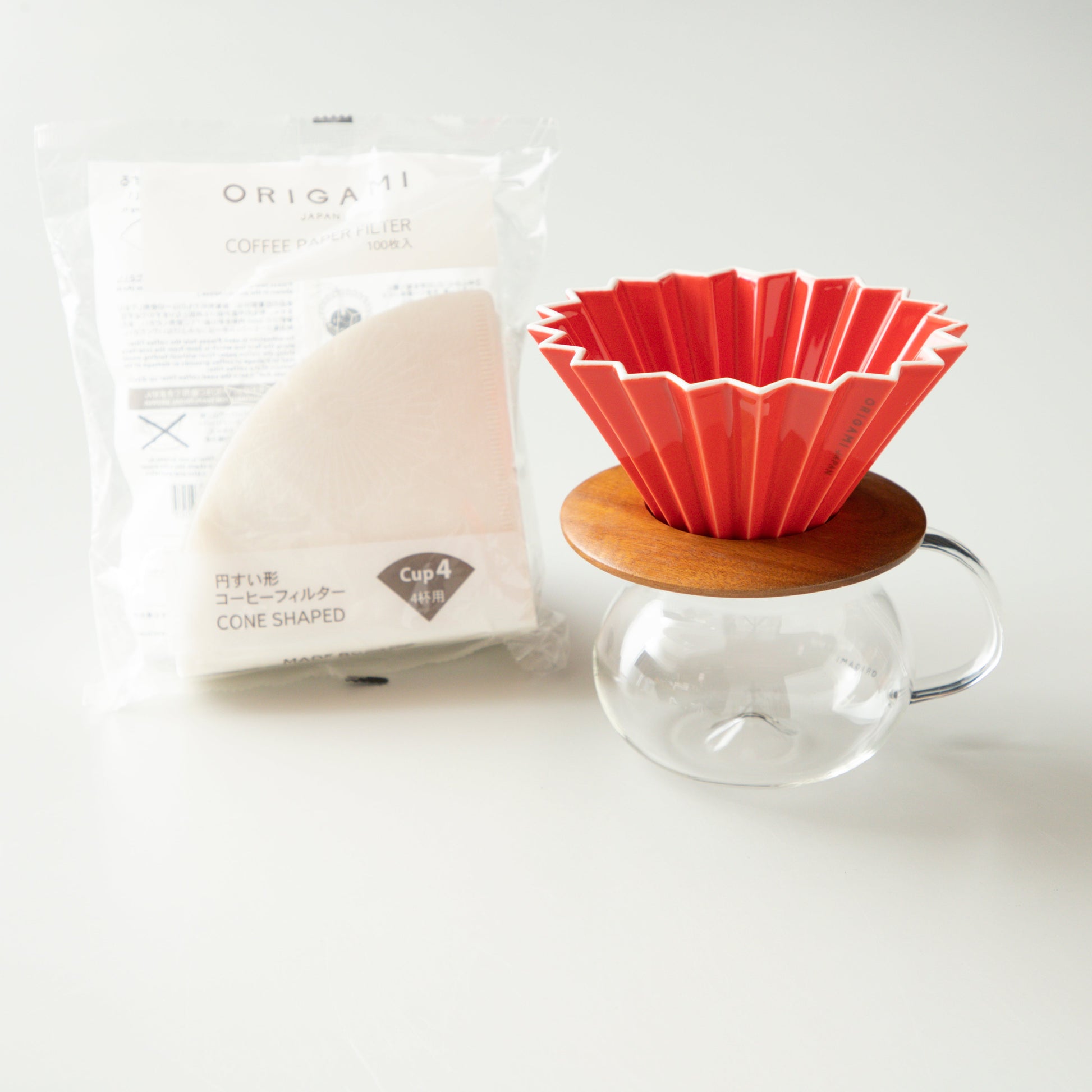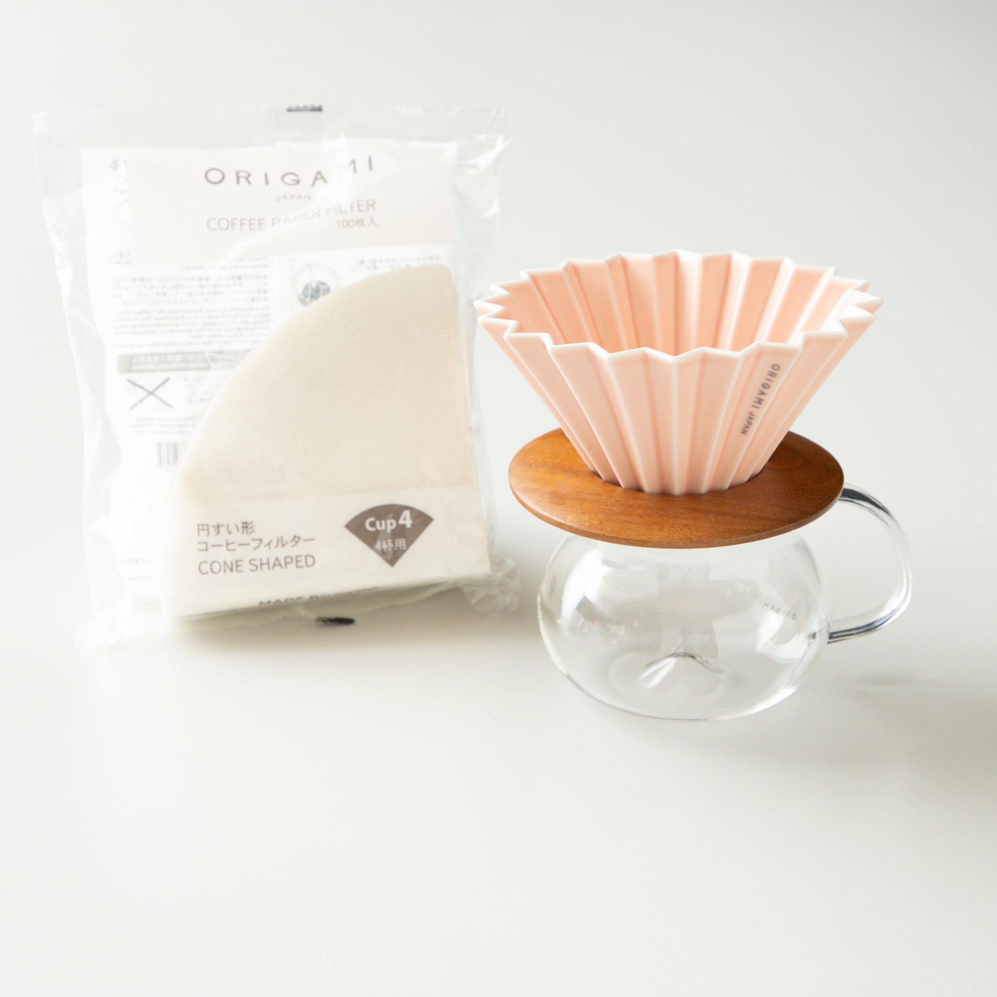 ORIGAMI Dripper M, Dripper Holder, PINOT Aroma Glass Server with paper filter.