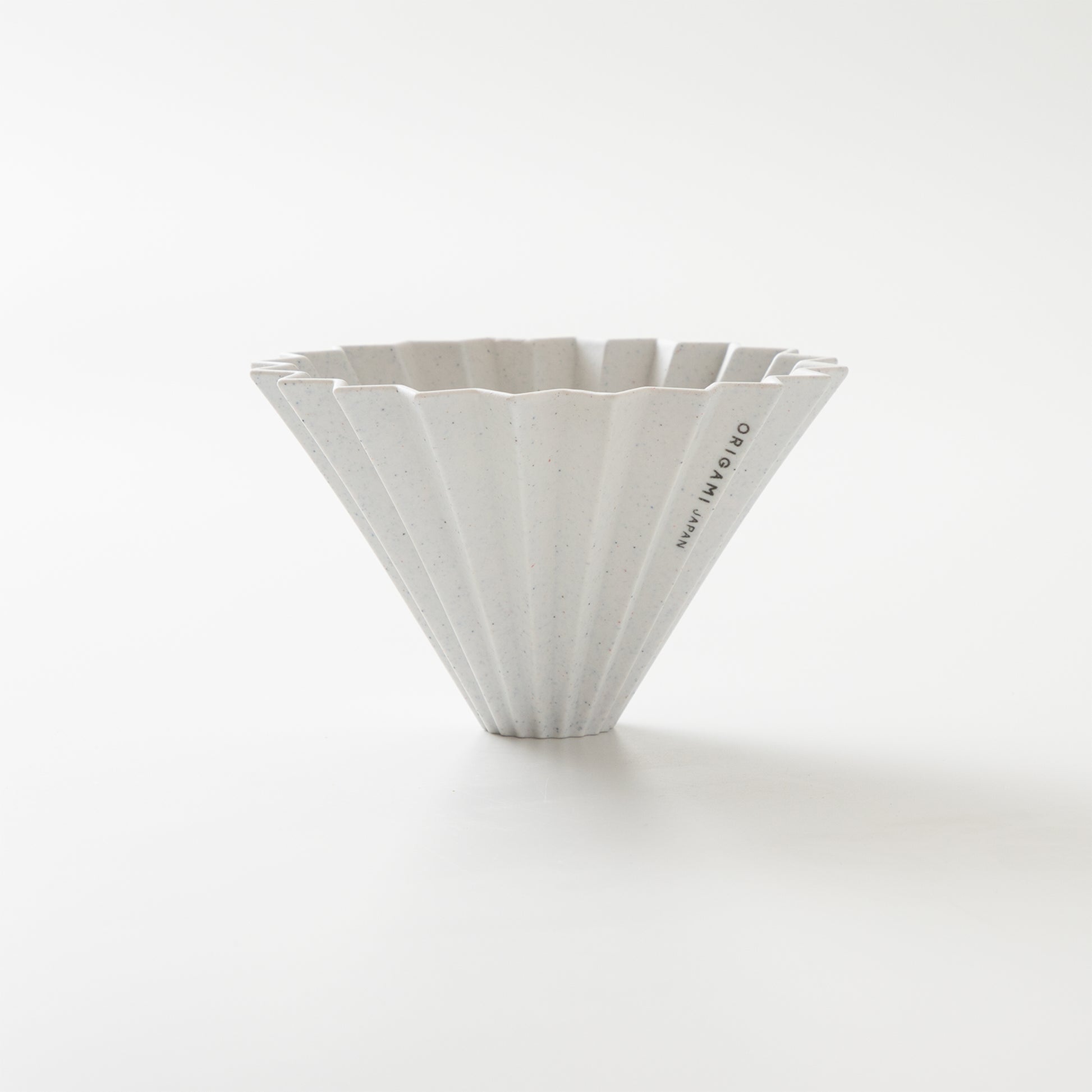 The 20 ribs (grooves) create a space between the dripper and the paper, allowing the hot water to escape smoothly and enabling a wide variety of brewing. The ORIGAMI Dripper's simple, lean product design has a “shimmering” appearance that can be felt because it is made from clay mixed with crushed recycled porcelain and fired.